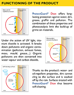 ProtectGuard® Dtox is an innovative product which combine water-repellent, oil-repellent, anti-graffiti and pollution-removing properties.